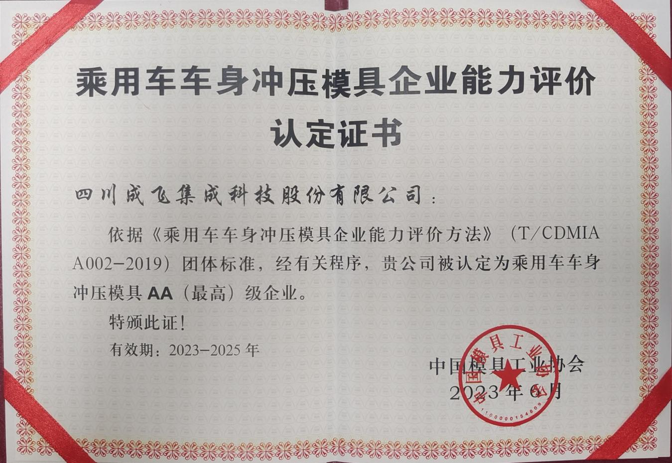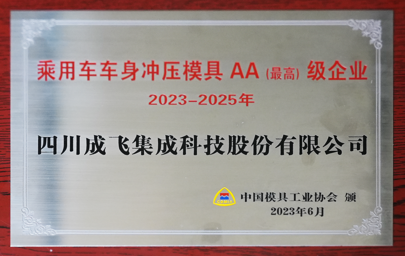 成飞集成喜获“乘用车车身冲压模具AA(最高)级企业”,并取得由中国模具工业协会颁发的《乘用车车身冲压模具企业能力评价认定证书》及牌匾。